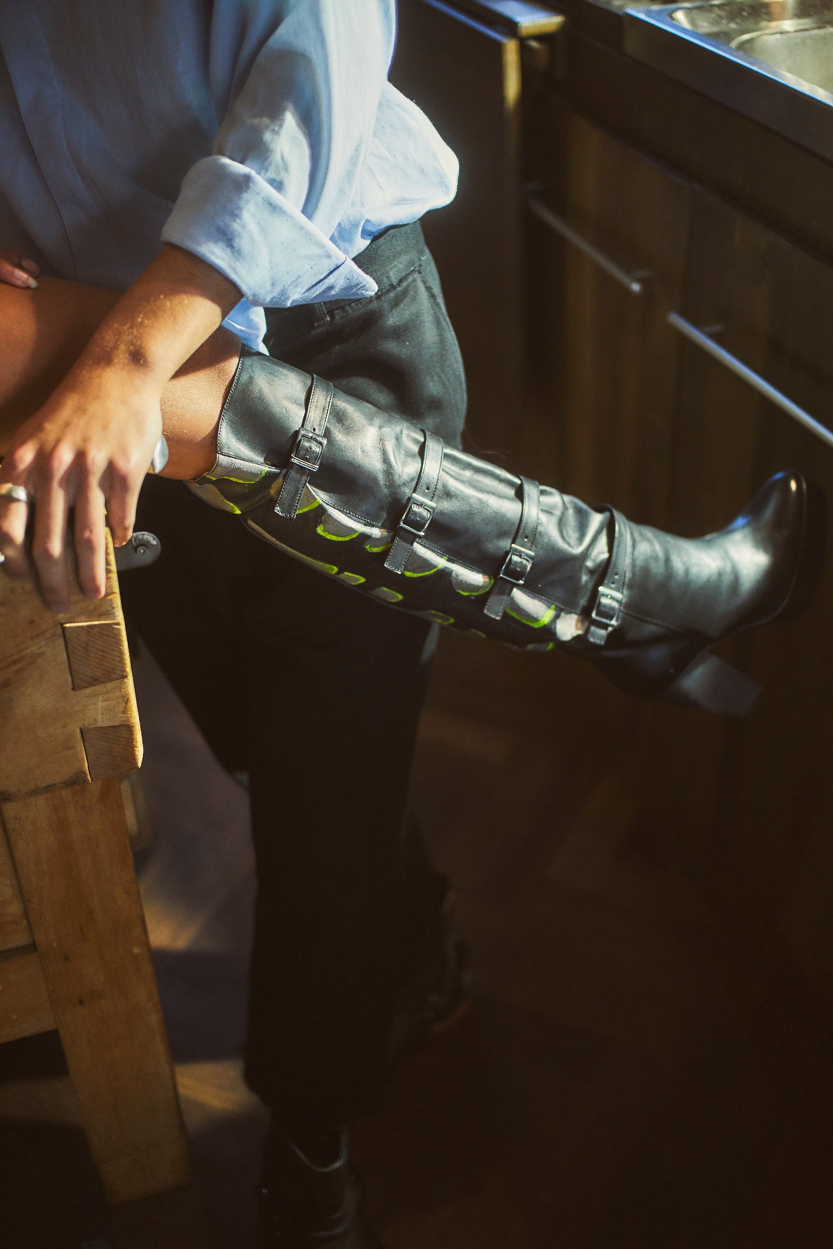 KNEE-HIGH BUCKLE UP BOOT WITH PAINTED CANVAS SHAFT ON BACK